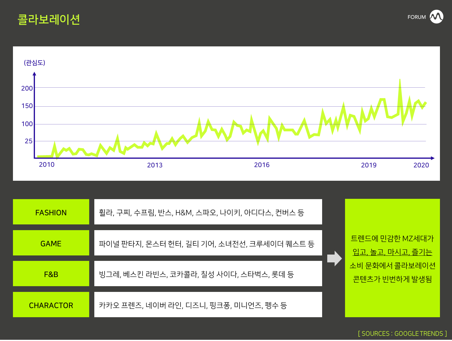모두가 콜라보레이션 활동을 적극적으로 펼치고 있는 기업이다. 이들의 산업군을 재분류해 보면 크게 패션, 게임, F&B, 캐릭터 등으로 정리해 볼 수 있다. 왜 이러한 현상이 나타났을까? 우리는 트렌드에 민감한 MZ세대가 입고, 놀고, 마시고, 즐기는 소비 문화에서 콜라보레이션 콘텐츠가 빈번하게 발생된다고 판단하였다. 끊임없이 신선하고 새로운 자극을 원하는 소비자들의 욕구와 취향을 맞추기 위해서 기업들은 이종 간의 결합을 통해 답을 찾고 있는 것이다. 콜라보레이션을 통해 인기를 끌고 있는 기업들을 콜라보 맛집 이라 표현하며, 한정판 형태로 출시되는 제품이나 서비스에 열광하기도 한다.