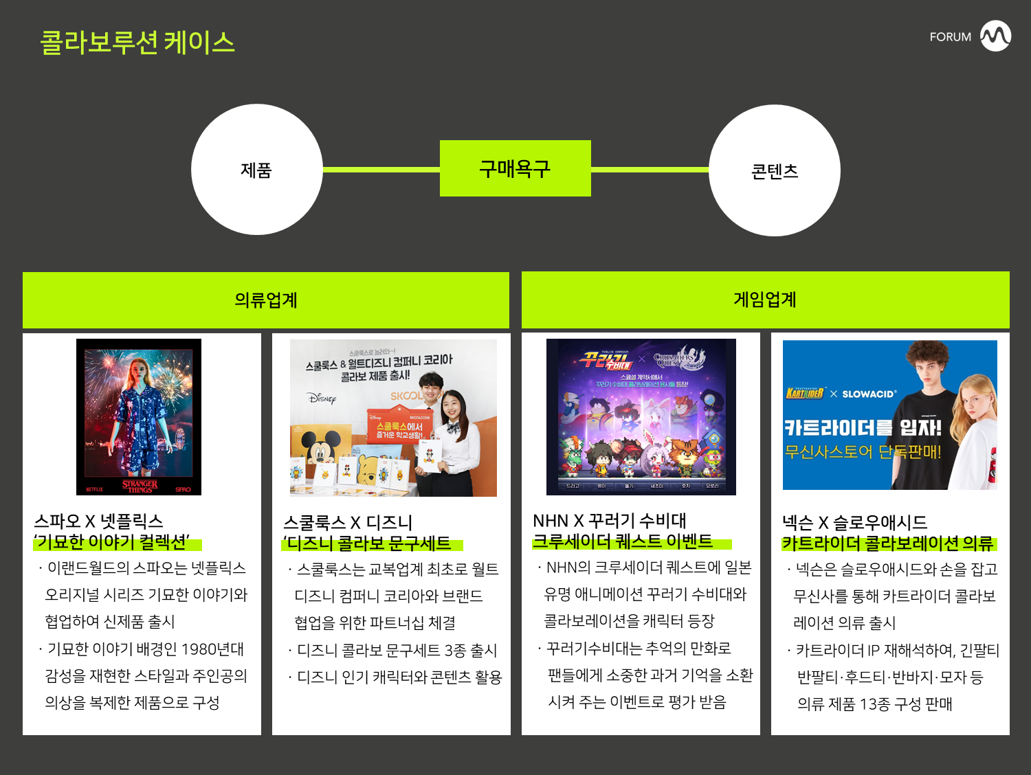 콜라보레이션이 활성화되면서 원천 IP(지적재산권)에 대한 관심이 높아지고 있다. 특히 콘텐츠 산업에 속한 많은 기업들은 원천 IP를 확보하여 이를 바탕으로 의류업계와의 협업을 강화시키고 있다. 제품 간 차별화가 어려운 의류업계 입장에서는 일정한 팬덤을 보유하고 있는 IP를 통해 소비를 촉진시키고 고객의 관심을 유도할 수 있기 때문이다.